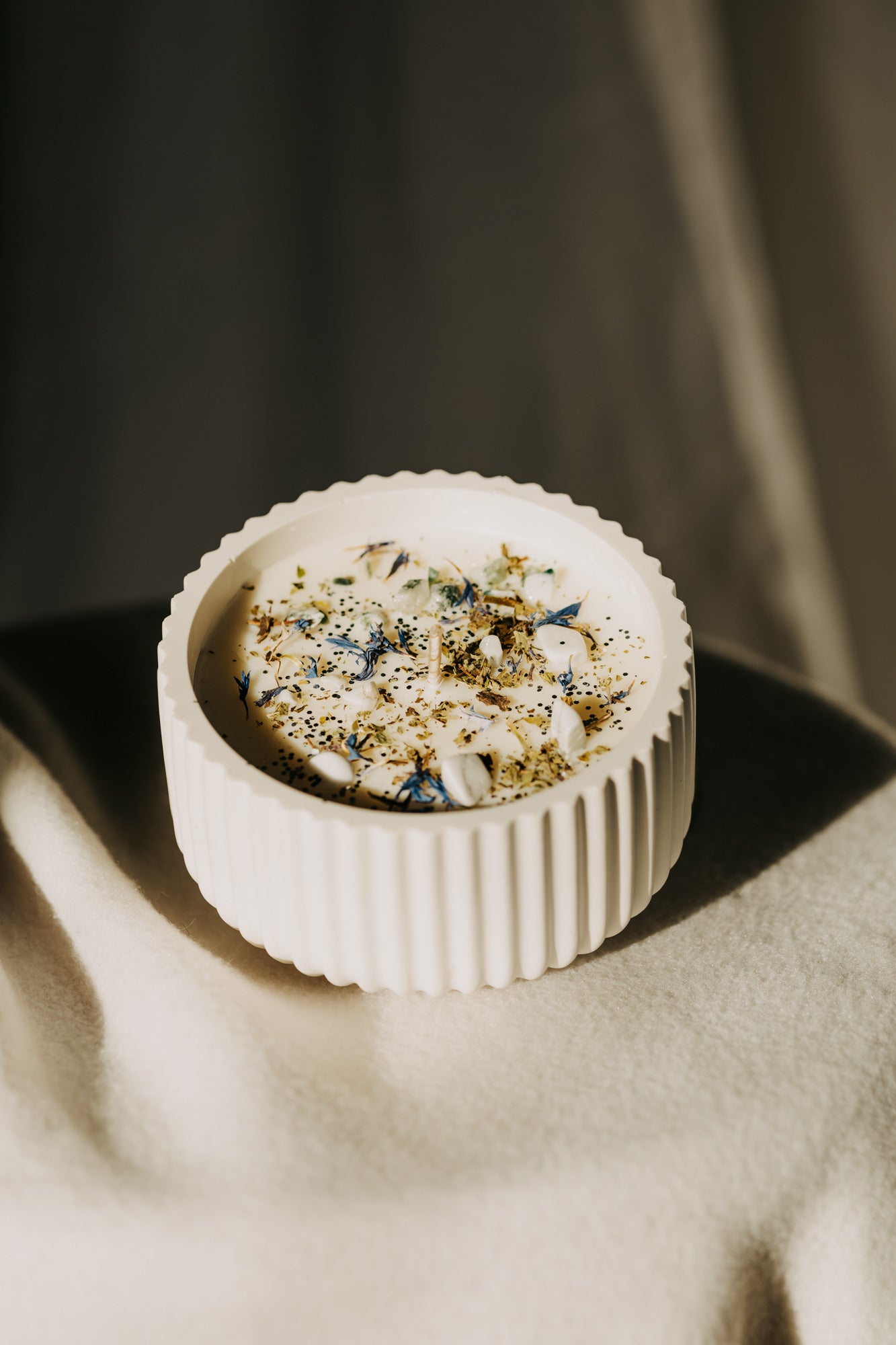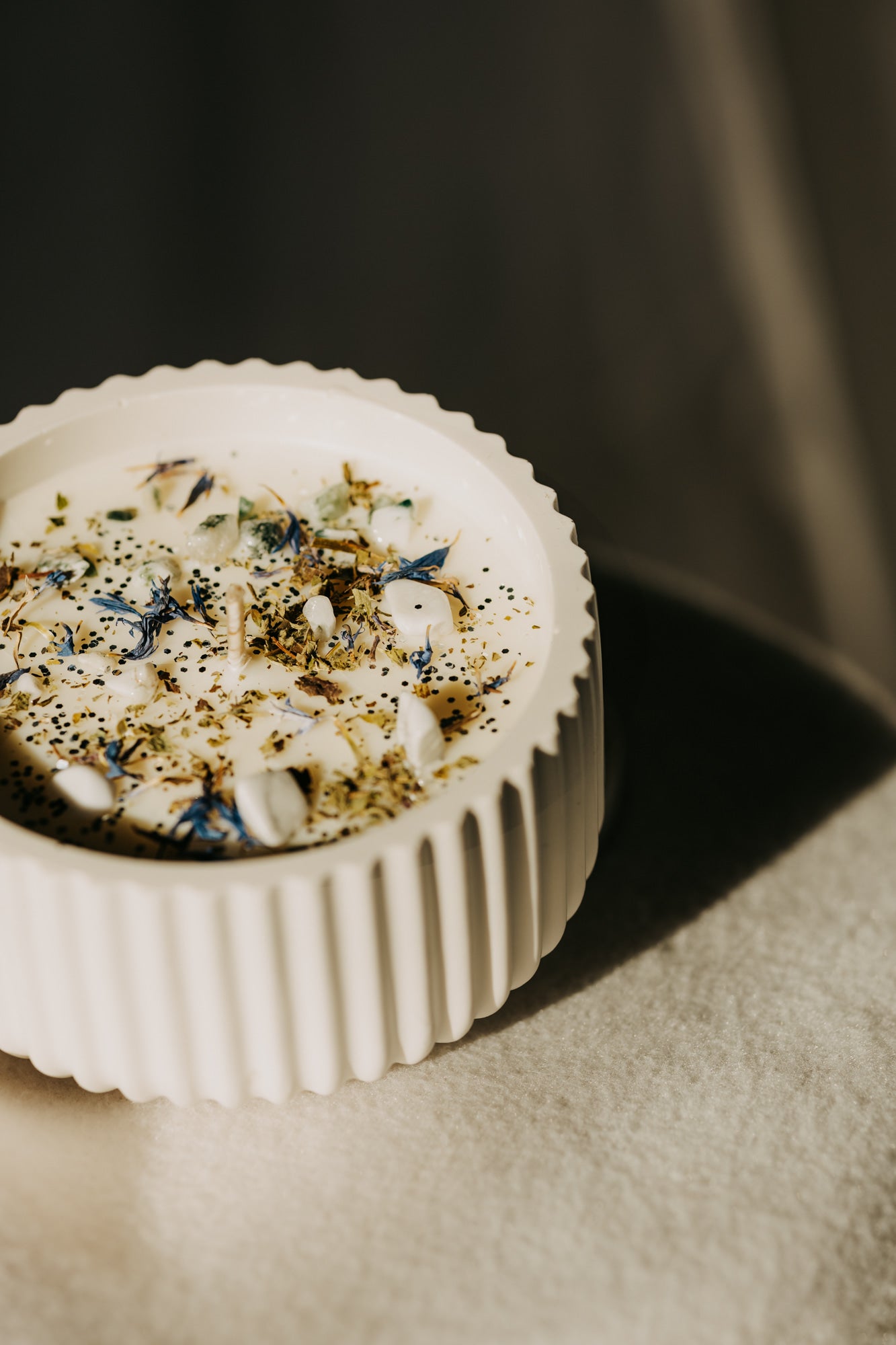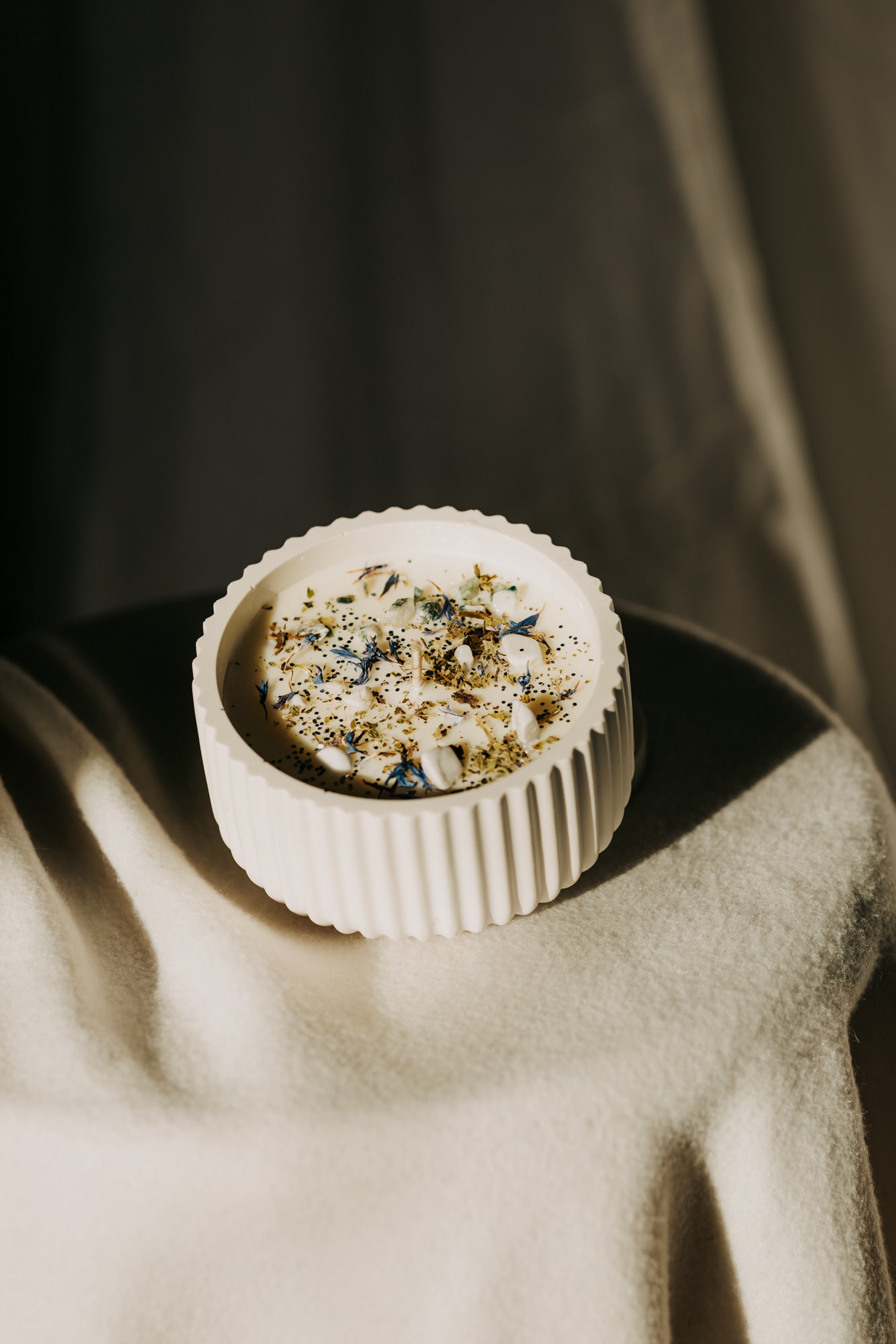 Les bougies de la collection "Intention" de Bougies d'Esprit sont coulées une à une à la main dans notre atelier avec de la cire végétale de soja, des mèches en pur coton, et sont également parfumées avec nos parfums issus de Grasse sélectionnés par nos soins garantissant une combustion sans phthalates ni substances cancérigènes (CMR).